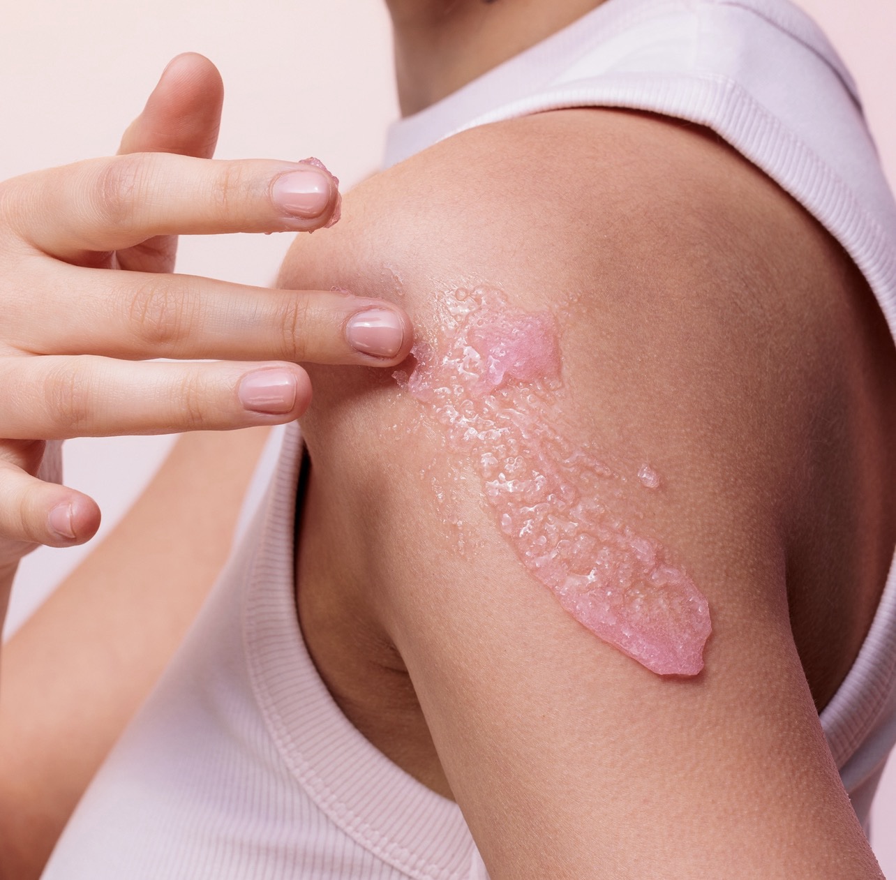 HAPI 2: Aplikoni një sasi të vogël skrabi dhe masazhojeni në lëkurë duke përdorur lëvizje rrethore.